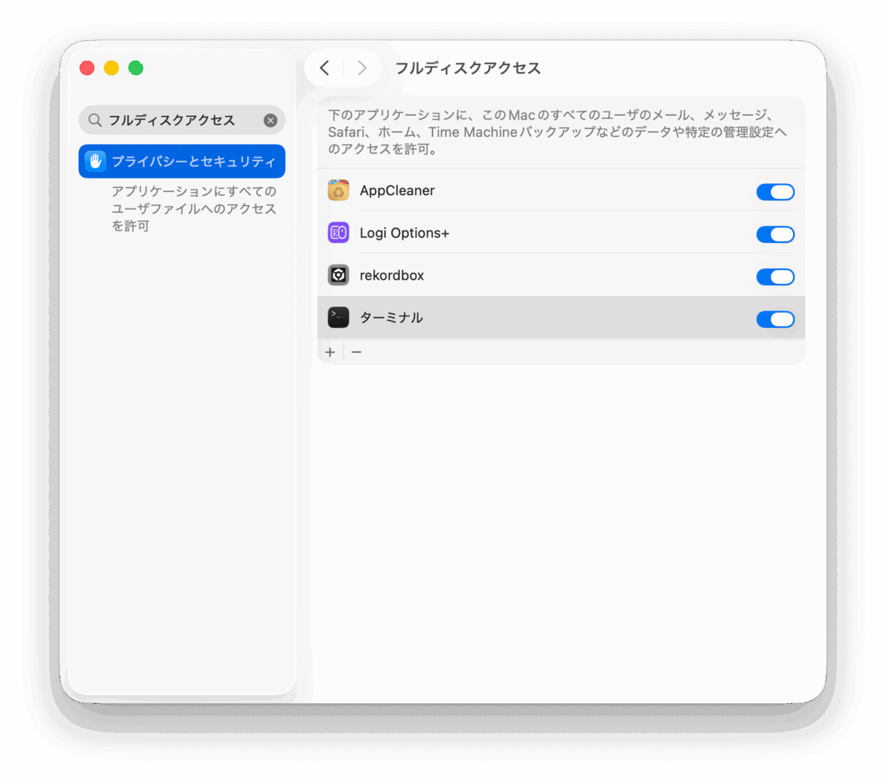 - システム環境設定 > プライバシーとセキュリティ > フルディスクアクセスを開く