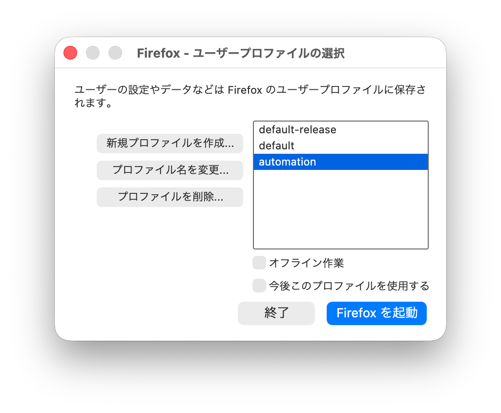 - Firefox はメインブラウザとしてゴリゴリに使ってるので、自動化操作用のプロファイルを別で用意しておく