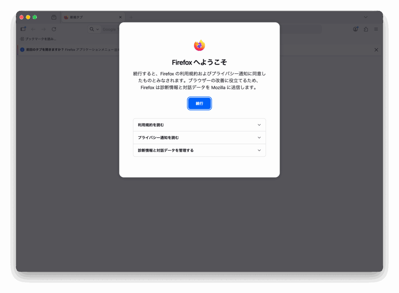 まっさらな状態のFirefoxが起動し、Firefoxを終了